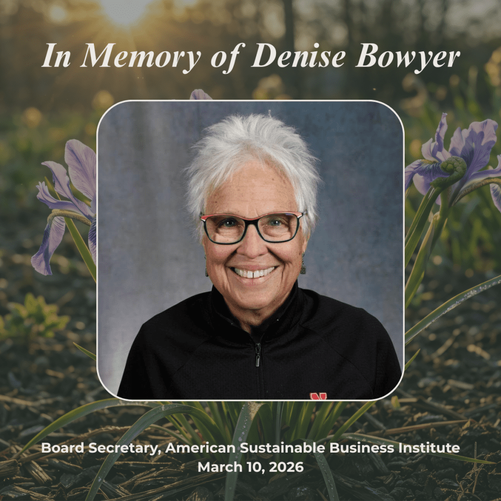 It is with profound sadness that the American Sustainable Business Network and our affiliates, American Sustainable Business Institute & Council, share the news of the passing of our beloved Board Secretary, Denise Bowyer, on March 10, 2026.