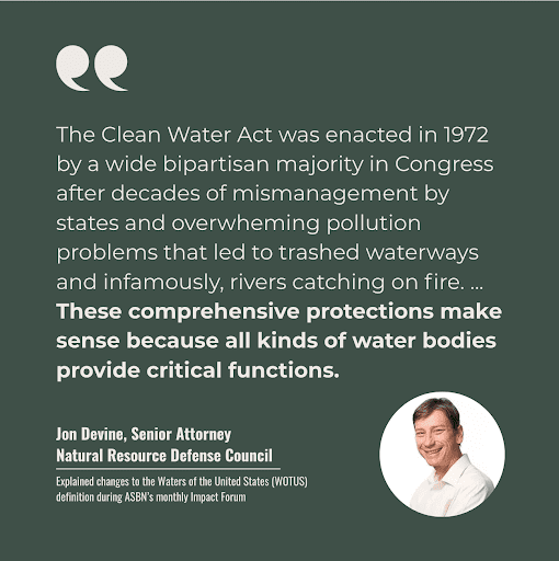 The latest installment in the American Sustainable Business Network’s (ASBN) members’ only webinar series, The Policy Forum, covered the critical topic of Waters of the U.S. (WOTUS) and its connection to the Clean Water Act. ASBN’s Manager of Agriculture & Water Policy, Liza LaManna, was joined by Jon Devine, Director of Freshwater Ecosystems at National Resources Defence Council (NRDC), and Jennifer Collins, Coalition Director of Clean Water for All.